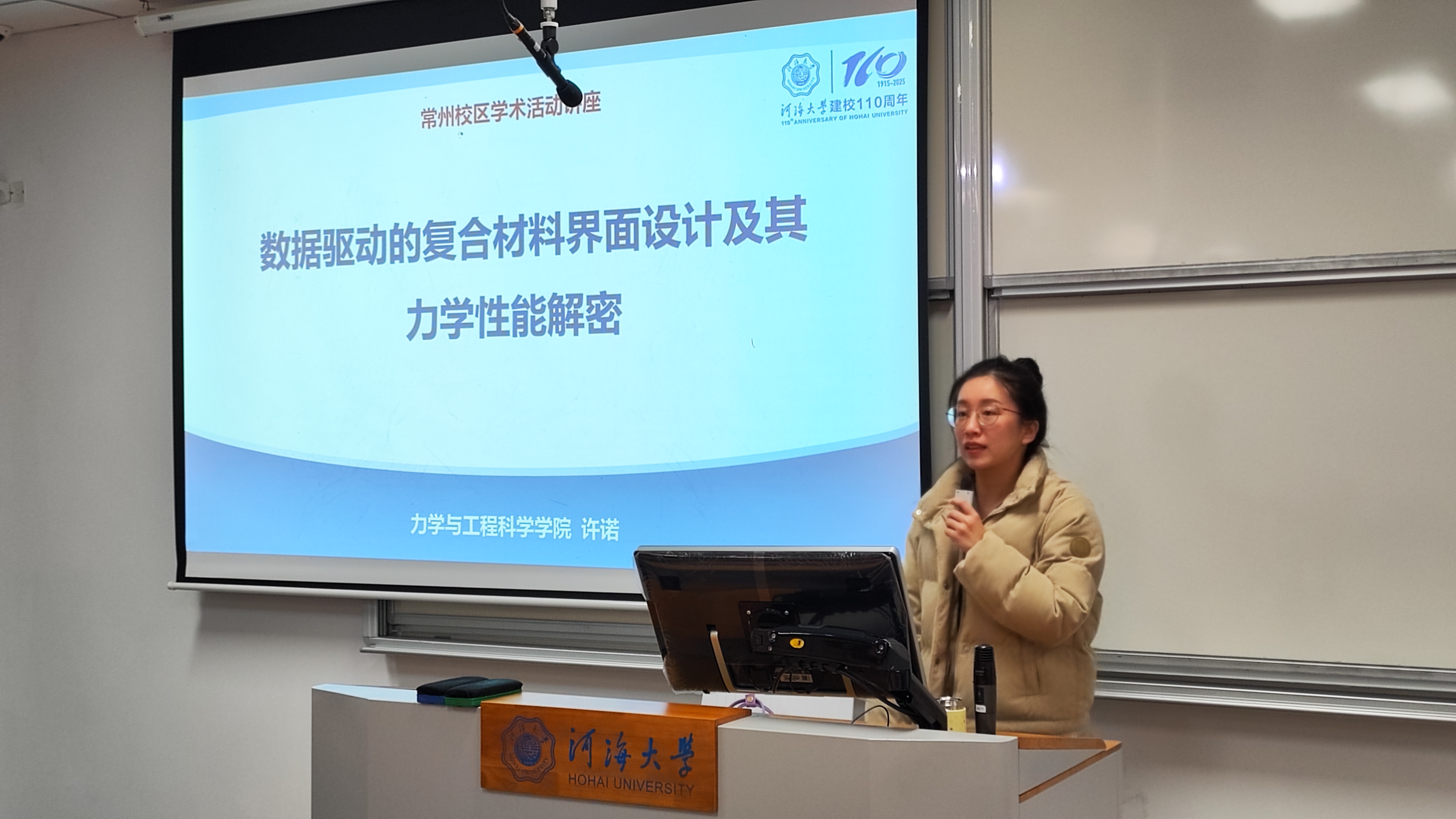 2025年12月3日,力学院许诺老师在常州校区2号楼A211作题为“数据驱动的复合材料界面设计及其力学性能解密”的学术讲座,常州校区30余名本科生参加。