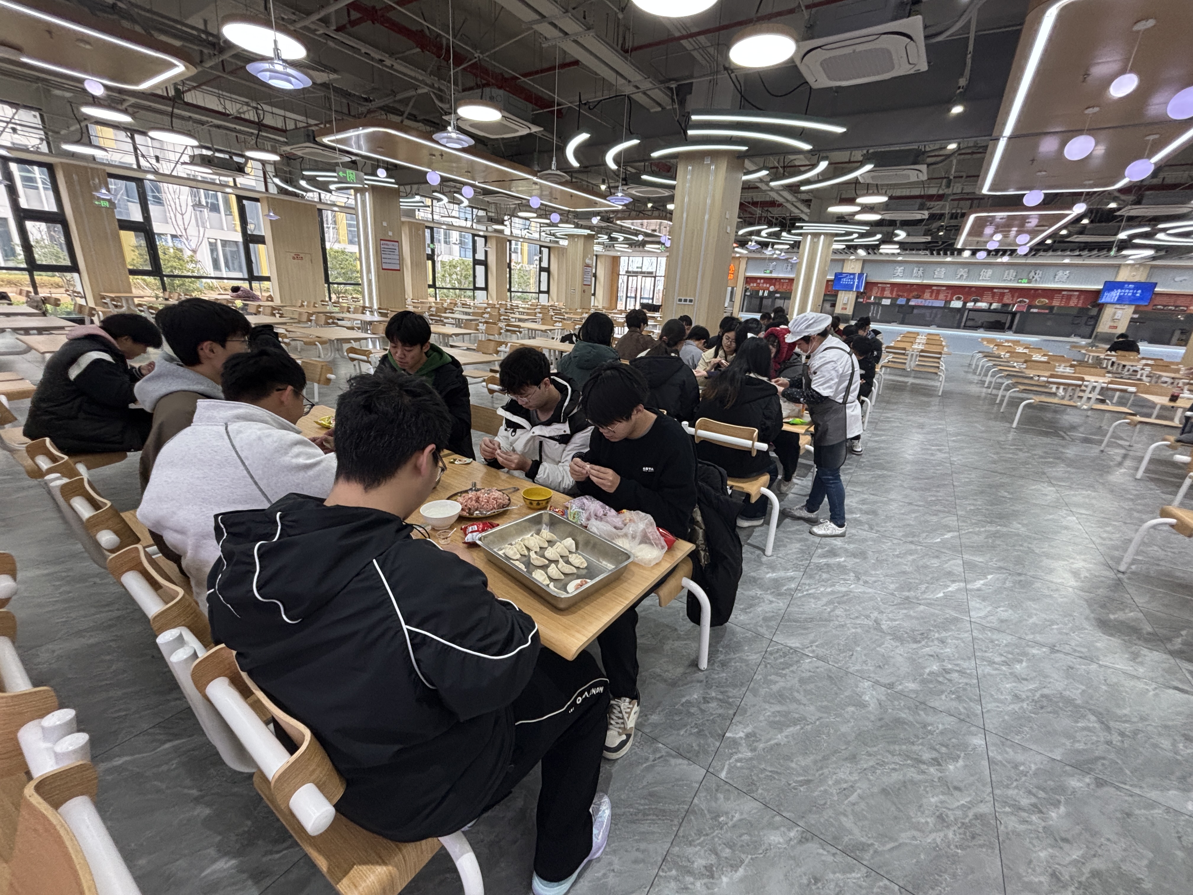 活动现场暖意融融,雪白的面皮、鲜香的馅料整齐摆放,节日氛围十足。食堂阿姨们手把手教同学们擀皮、包馅的技巧,大家围坐桌前一边忙活一边畅谈家乡冬至习俗,将节日的暖意与同窗的情谊包进一个个饱满的饺子里。