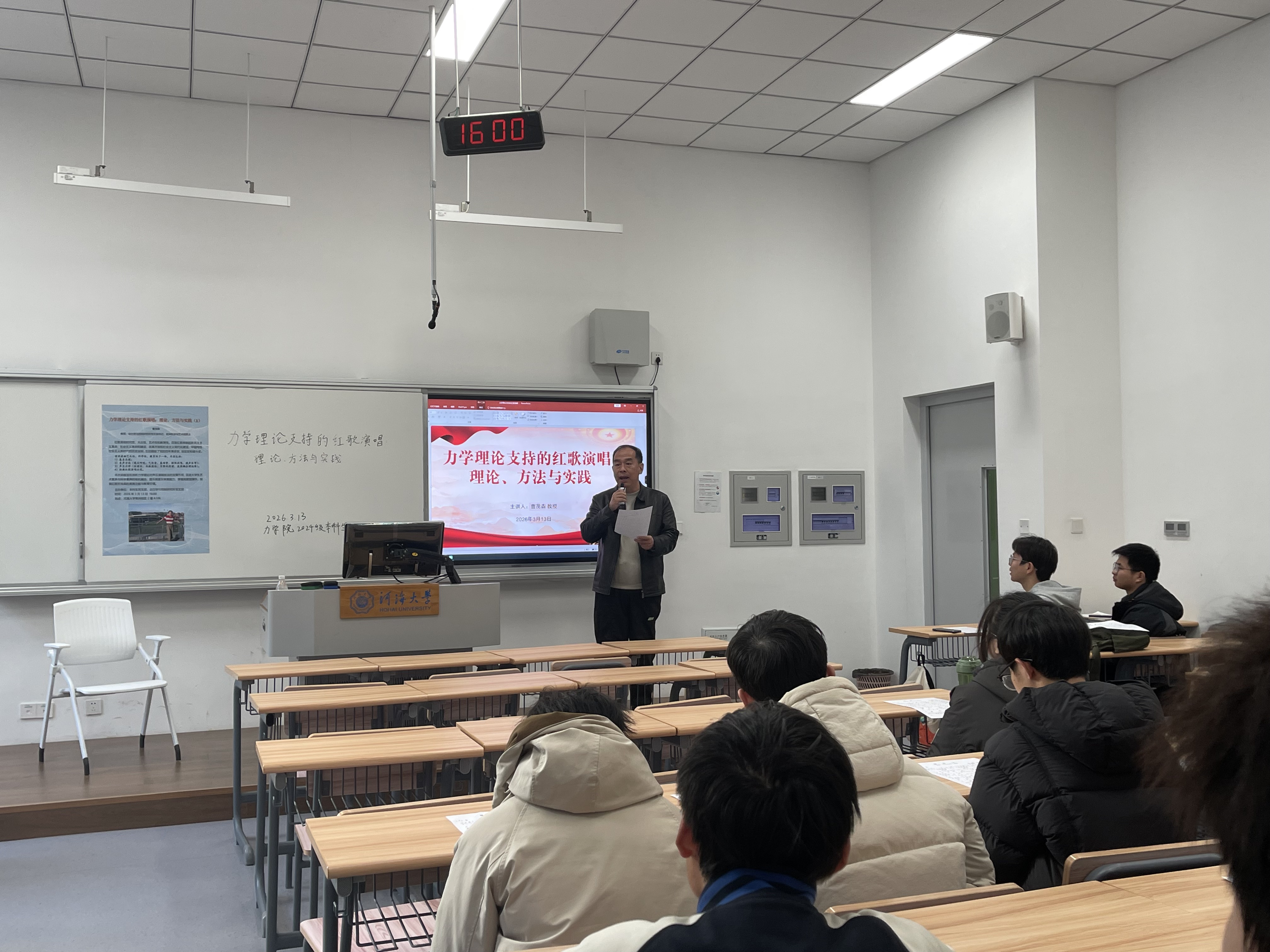 2026年3月13日,“全国党建工作样板支部”动力学与控制研究所党支部书记曹茂森教授在常州校区为力学院2024级本科生党员、入党积极分子主讲了题为“力学理论支持的红歌演唱:理论、方法与实践”的主题音乐党课。